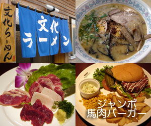 今日は1日4食! 夕食前に熊本ラーメンを! 飛行機乗る前に馬肉料理。最後まで食べた〜。 |